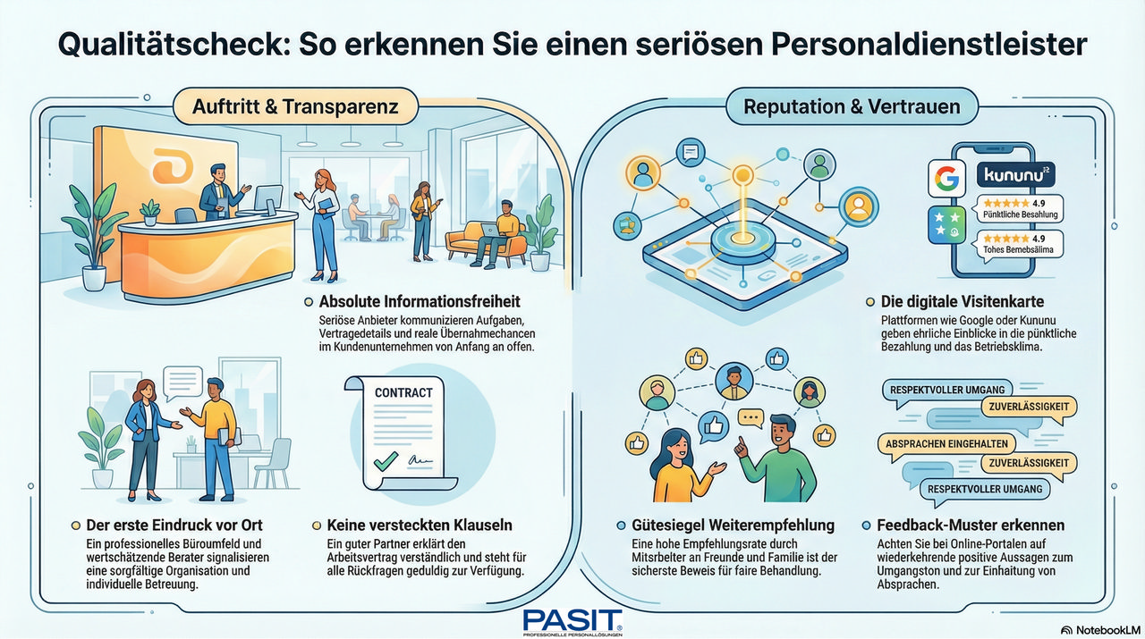 Machen Sie sich über die Zeitarbeitsfirma oder den Personaldienstleister schlau, bevor Sie dort ein Vorstellungsgespräch vereinbaren. In den gängigen Bewertungsportalen wie Google oder Kununu finden Sie die Erfahrungen anderer Mitarbeiter und Einblicke in die Arbeitsweise des Unternehmens. Hier teilen die Bewerter oft hilfreiche Insight: Wird das Gehalt pünktlich gezahlt? Wie ist der Umgangston? Werden Absprachen eingehalten? Zwar ist nicht jeder kritische Kommentar für bare Münze zu nehmen, doch das Gesamtbild in den sozialen Medien und Bewertungsportalen liefert Ihnen einen guten Eindruck darüber, wie die tatsächliche Zusammenarbeit mit der Zeitarbeitsfirma im Alltag aussieht.