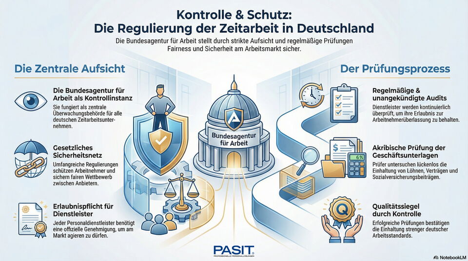 - Die Bundesagentur für Arbeit fungiert als zentrale Überwachungsinstanz für alle Zeitarbeitsunternehmen in Deutschland.